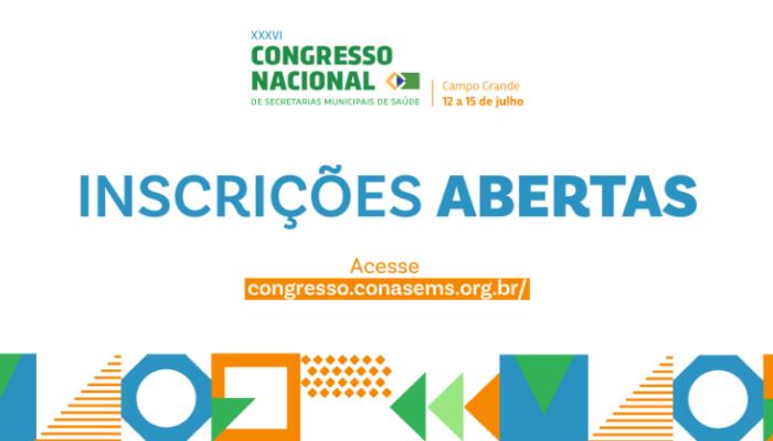 As inscrições para o XXXVI Congresso Nacional de Secretarias Municipais de Saúde estão abertas! Com o tema “Diálogos do Cotidiano no Horizonte da Gestão Municipal do SUS”, a edição deste ano acontece entre os dias 12 e 15 de julho, em Campo Grande-MS. As inscrições podem ser feitas até dia 24 de junho. O encontro conta com ampla programação e reunirá gestores, trabalhadores e profissionais do SUS de todos os estados do país.